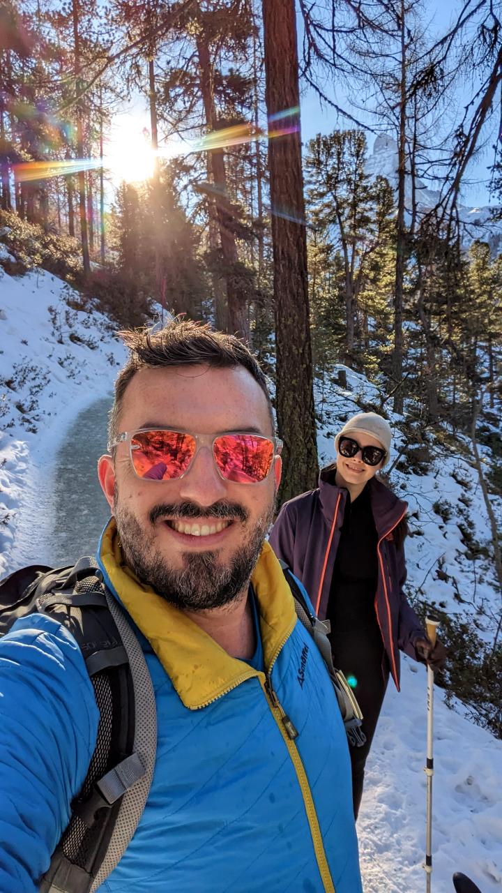 Our next stop on the 5 lakes hike was Moosjisee. The path from Grünsee to Mosjisee leads past numerous gnarled stone pines and larches, which give the landscape a mystical appearance and the air a wonderfully spicy aroma. After a short descent, we crossed a mountain river with bubbles over a wooden bridge. From there, we could spot the milky blue color of Moosjisee, a reservoir fed by glacier water.